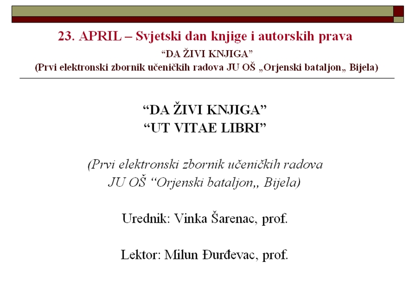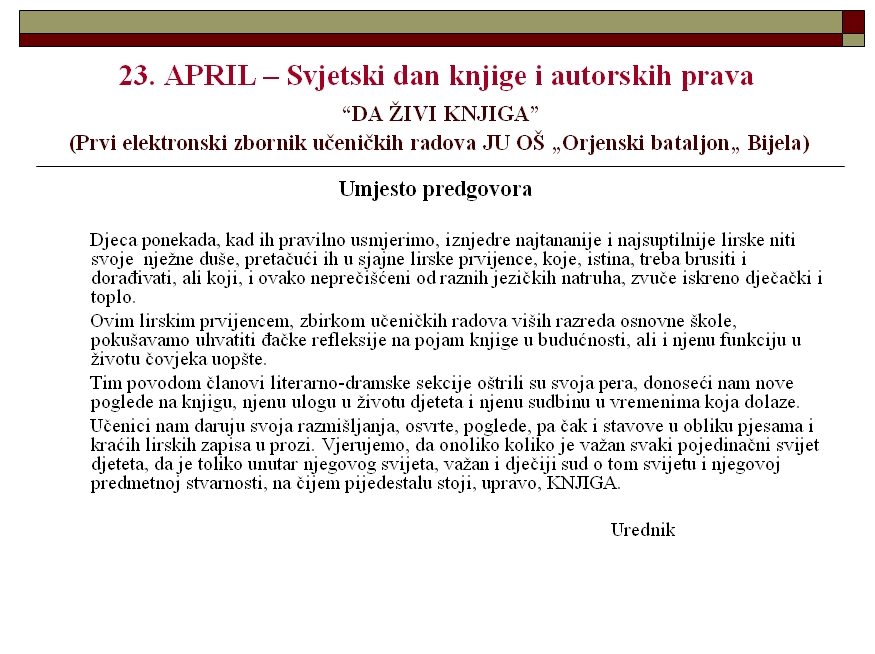“Da živi knjiga” – Prvi elektronski zbornik učeničkih radova JU OŠ “Orjenski bataljon”