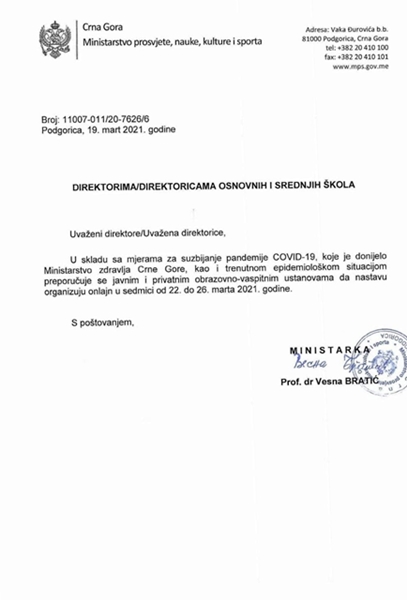 Od srijede, 31. marta 2021. godine nastava će se realizovati u Školi, po tekućem rasporedu časova. https://mps.gov.me/vijesti/241525/skole-i-vrtici-u-Herceg-Novom-Kotoru-i-Pluzinama-od-sjutra-pocinju-sa-redovnim-radom.html