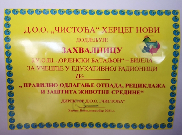 Zaposleni iz DOO “Čistoća”, 10. novembra 2021. godine, održali su edukativnu radionicu u našoj školi pod nazivom “Pravilno odlaganje otpada, reciklaža i zaštita životne sredine” i tom prilikom je pokrenuta akcija. Sakupljene čepove preuzeli su 23.12.2021. godine, tokom ponovne posjete školi, nakon čega su predati u poslovnicu Pošte u zgradi Opštine Herceg Novi, kako bi bili dostavljeni na krajnje odredište.