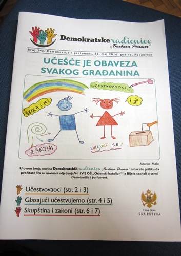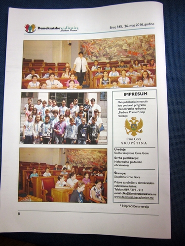Dok su novine odštampali, mi smo posjetili Parlament. Djeca su bila veoma iznenađena i radoznala. Tu je izvedena simulacija sjednice Skupštine, gdje su oni predlagali, dopunjavali, obrazlagali i glasali za određena pitanja, u ulogama poslanika i Predsjednika Skupštine.