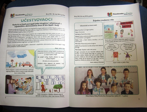 Tema je bila ”Demokratija i parlament”. Djeca su podijeljena u više grupa. Svaka grupa je imala određene aktivnosti koje će im pomoći da urađenim materijalom dođu do izrade novina, koje će odštampati njihovi domaćini.