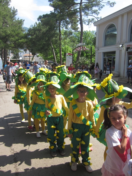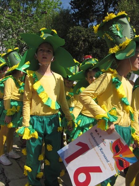 6. maja 2018. godine, učenici II 1 razreda nastupili su na Dječijem karnevalu u Budvi. U saradnji sa roditeljima, kolona „mimozica“ ispod krševitog Orjena, smjelo je krenula ka „kraljici turizma“, gdje su ih srdačno dočekali ljubazni domaćini. Od oko 700 maskirane djece, iz 25 grupa različitog uzrasta, po redosledu nastupa naša maska dobila je broj 16,pod kojim je u lepršavoj povorci, krenula ka zidinama Starog grada Budve. Usput, prilazili su im domaći i strani gosti, kao i puno djece u želji da se fotografišu za uspomenu, a sam nastup na glavnoj bini odlično je primljen i pozdravljen od strane publike.