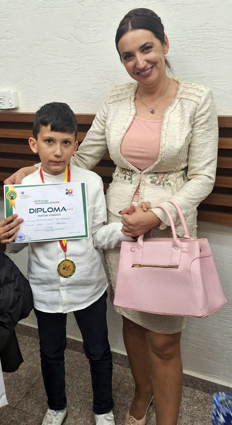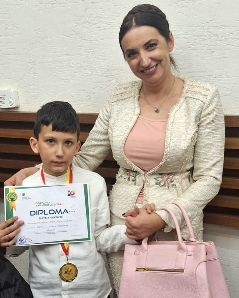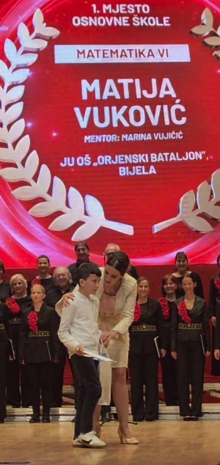 Nagradu za osvojeno prvo mjesto iz Matematike u kategoriji šestog razreda osnovnih škola, Matiji Vukoviću (VI-2) uručila jeprof. dr Anđela Jakšić-Stojanović, ministarka prosvjete, nauke i inovacija. U pratnji učenika bila je i njegova mentorka, Marina Vujičić.