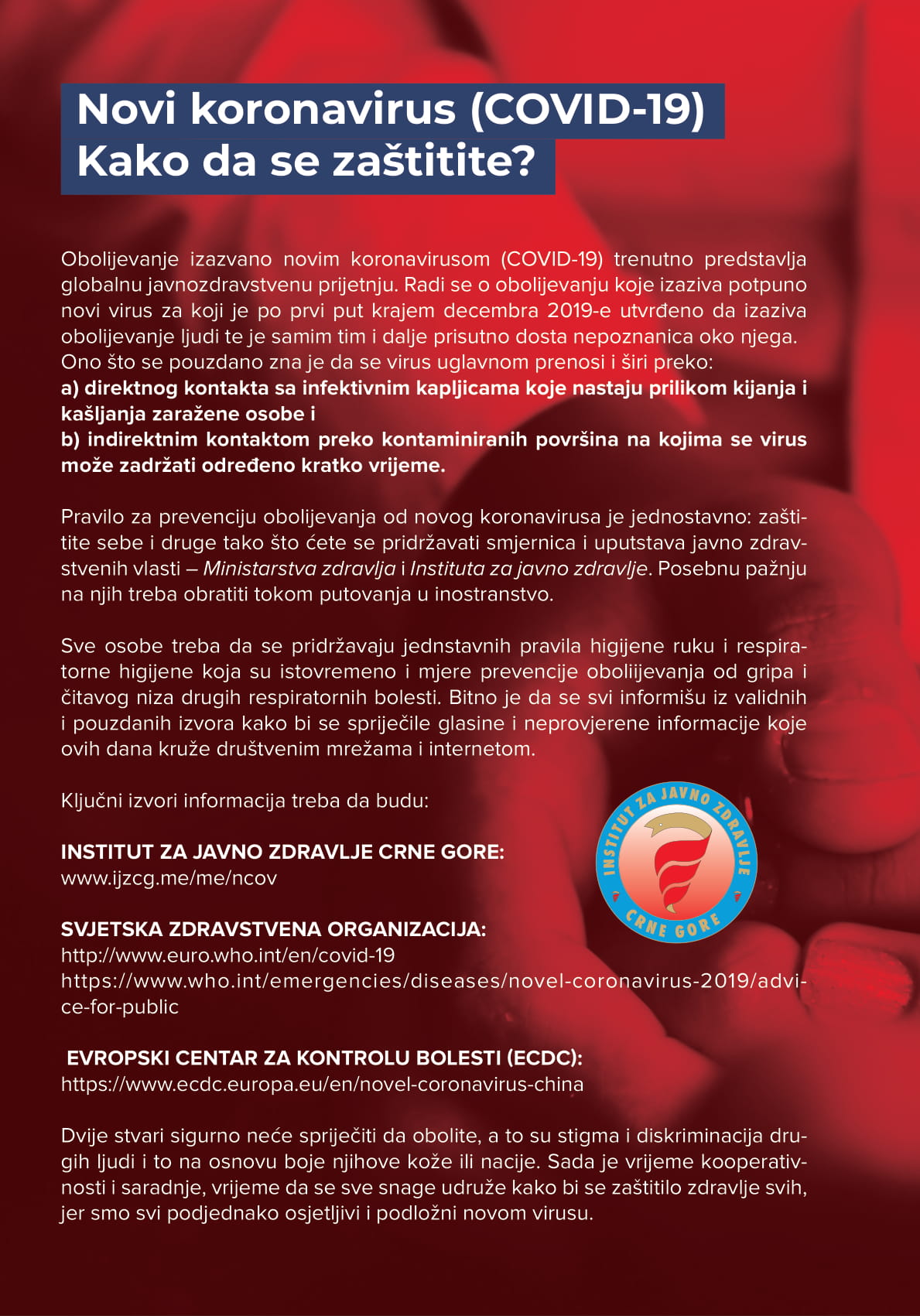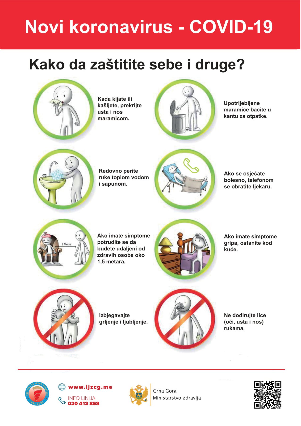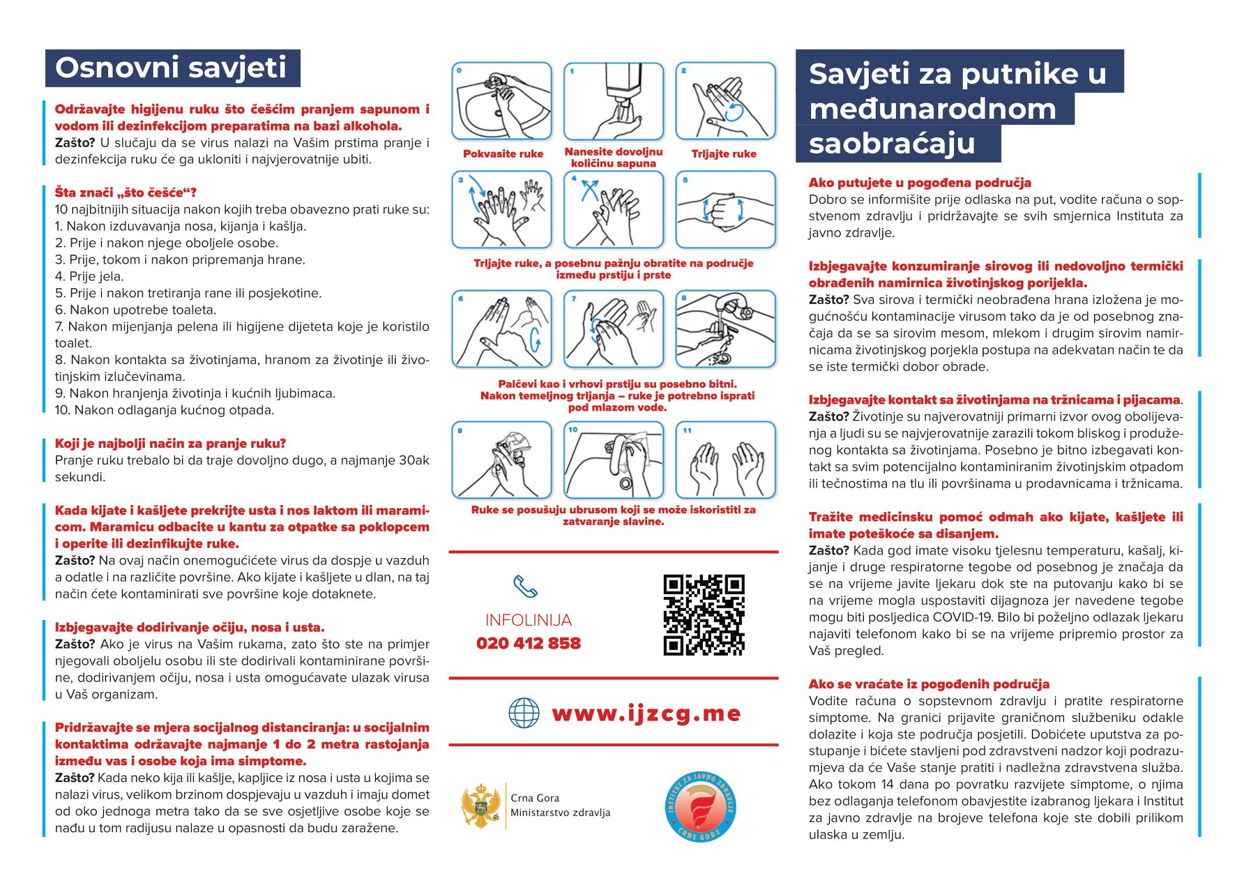 Brošure o mjerama prevencije i suzbijanje infekcije koronavirusom, pripremljene od strane JU Institut za javno zdravlje Crne Gore.