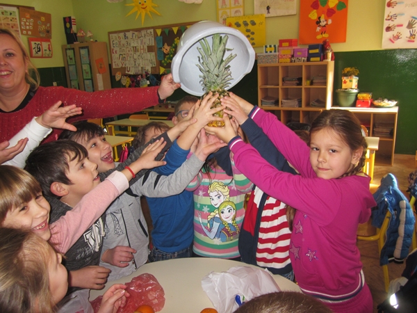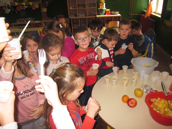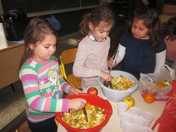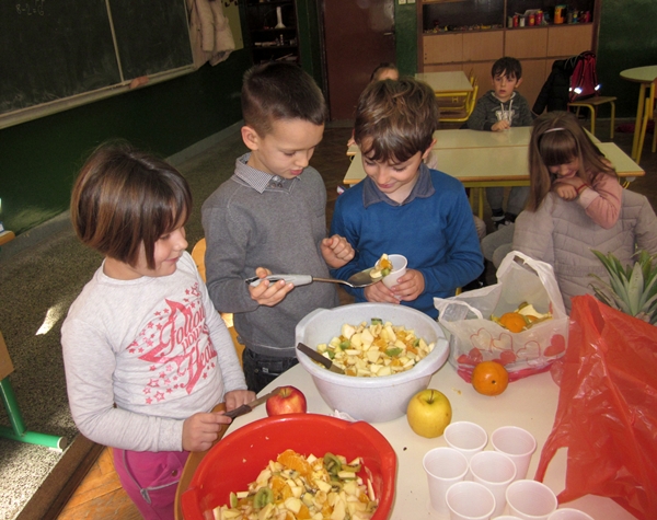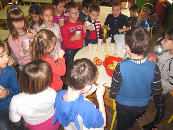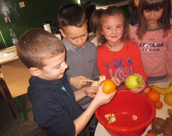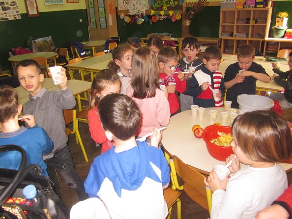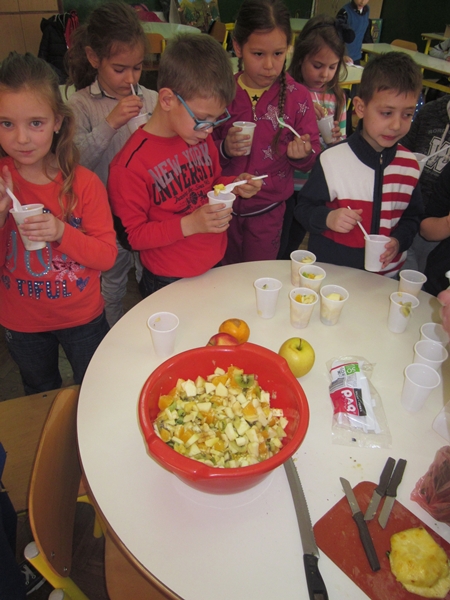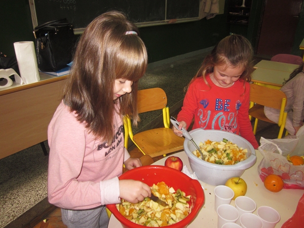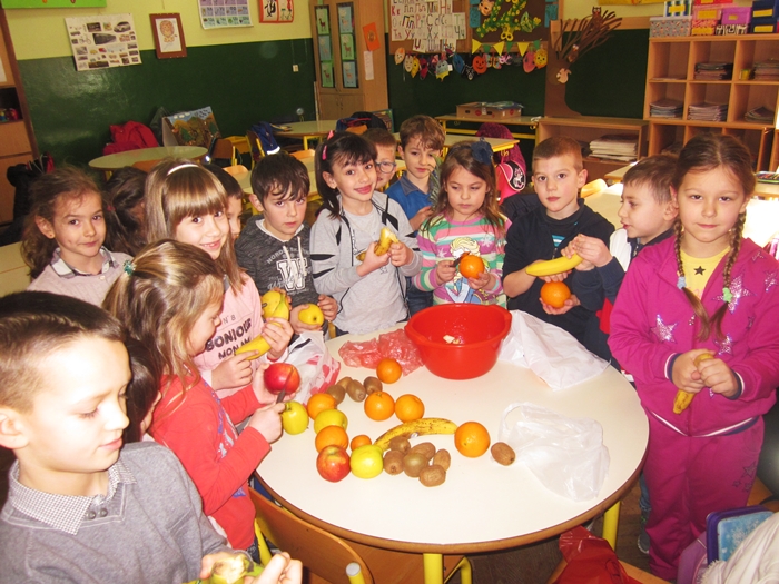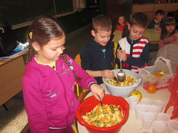 Učenici I 1 odjeljenja donijeli su razne vrste voća (jabuke, kruške, narandže, banane, ananas), a učiteljica i vaspitačica potreban pribor (zdjele, noževe, viljuške, plastične tanjiriće, salvete i čaše). Sva djeca su bila aktivna i učestvovala su u pripremanju. Na kraju časa, zadovoljni i razdragani, okusili su salatu koju su napravili, uživajući u slastima zdravih voćnih plodova, prepunih vitamina. Uz ovu voćnu salatu, brže se raste i u svemu napreduje.