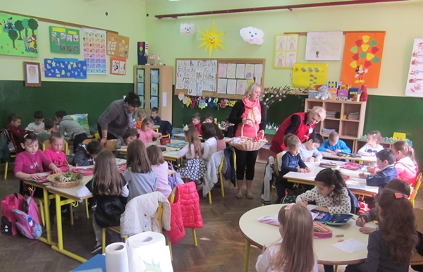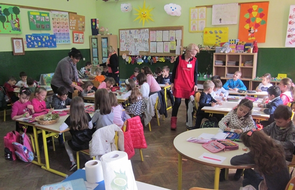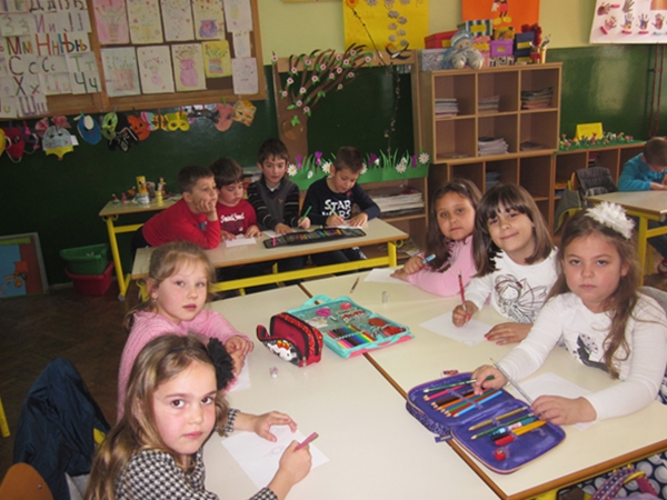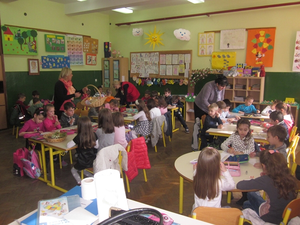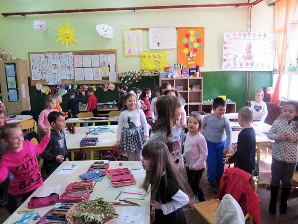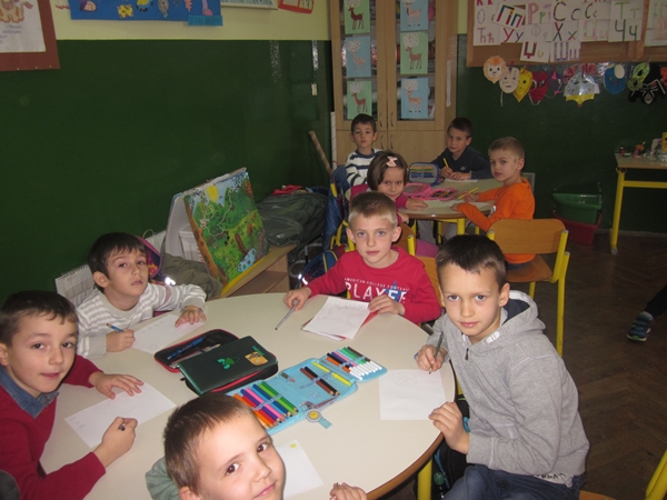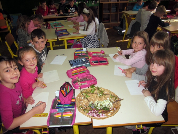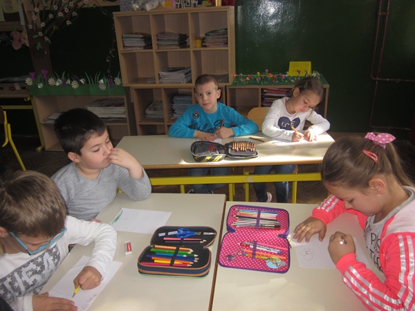 Kroz razgovor došli smo i do zaključka da su nam maleni gosti došli kao vjesnici proljeća. U učionici su imali uređen kutak sa prvim proljećnim cvjetovima i drvo čija je krošnja procvjetala, pa smo to iskoristili da sem riječima, predstavimo i crtežom, uz pjevušenje pjesama sa CD „Visibaba“ i „Proljeće“. Za kraj, djeca su plesala uz muziku, izražavajući i pokretima svoja osjećanja.
