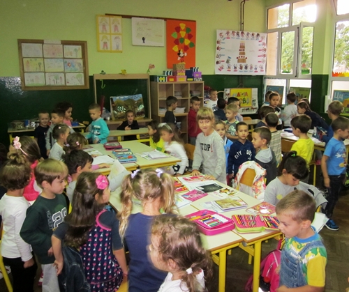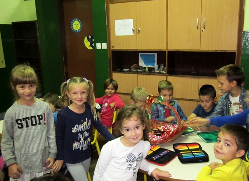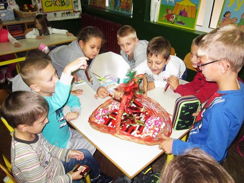 Učenici su svoje mlađe drugare dočekali sa dobrodošlicom i korpom slatkiša, a predškolci su, takođe, donijeli puno slatkiša za svoje drugare, prvačiće.