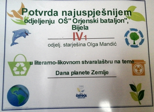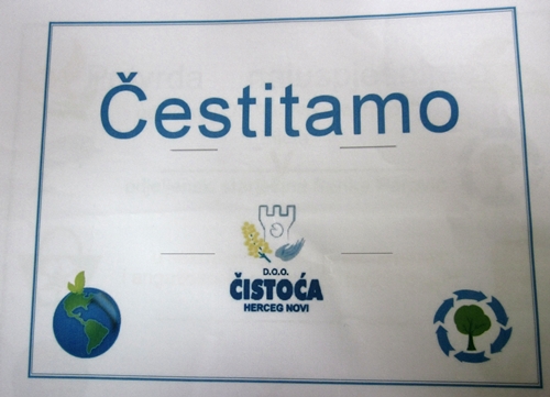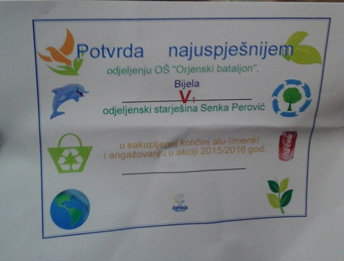 Preduzeće DOO „Čistoća“ iz Herceg Novog u okviru Pojekta edukacije o otpadu i zaštiti životne sredine kod ustanova koje se bave školskim obrazovanjem, 14.04.2016. godine, u Školi je organizovalo akciju sakupljenja limenki za reciklažu. Odjeljenje V1 je bilo najuspješnije, pa je dobilo pohvalu i nagrađeni su novčanom nagradom i slatkišima. Tom prilikom su dobili dvije nove kante za buduće sakupljanje reciklažnog materijala.