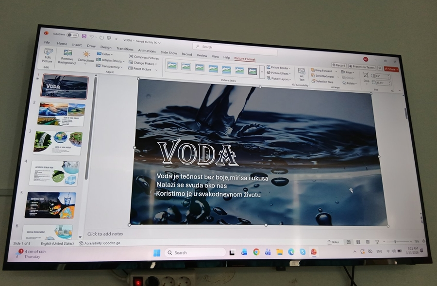 Učenici su rješavali osmosjmerku i asocijaciju, putem prezentacije učili o vaznosti i očuvanju vode, dok su kroz grupni rad pokazali koliki je značaj vode za život na planeti, za sta se koristi i kako je sačuvati. Na kraju su napravili model planete Zemlje na koji su lijepili svoje poruke o vodi.
