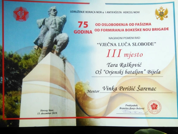 Na literarnom konkursu za učenike osnovnih škola kojeg su raspisali UBNOR i antifašisti Herceg Novog, povodom 75 godina oslobođenja Herceg Novog i većeg dijela Crne Gore i 75 godina od osnivanja Prve bokeljske udarne brigade, na temu „Vječna luča slobode“, učenica VIII 1 Tara Rašković (mentor Vinka Šarenac) osvojila je treće mjesto.