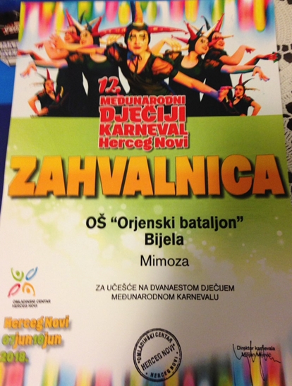 9. juna 2018. godine održan je XII Međunarodni dječiji karneval u Herceg Novom. Na toj manifestaciji učestvovale su dvije vesele i razdragane grupe, koje su na veličanstven i dostojan način predstavljale našu Školu.IMG-dfb68faad4b405b9d123324f4c3b4870-V To su bili „Čuvari planete“, učenika I 3 iz PU Baošići-Đenovići sa učiteljicom Brankom Todorović i učenici II 1 iz matične škole u Bijeloj, sa grupnom maskom „Mimoza“ i učiteljicom Senkom Perović. Povorka djece, pod maskama, kretala se od trga Belavista do zgrade Opštine.